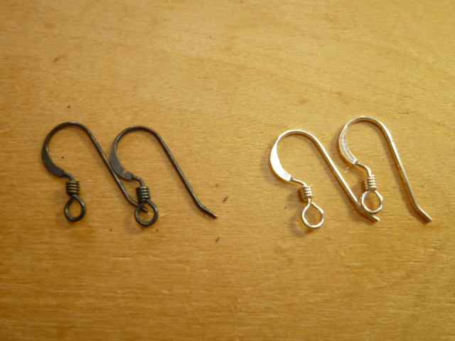 右がシルバー本来の色で、左が温泉成分で黒くなってしまったピアスフック。