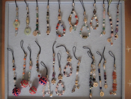 全部違うデザインで作り、並べて眺めているとカワイイ~♪ 手放したくなくなってくるけれど、私携帯ひとつしか