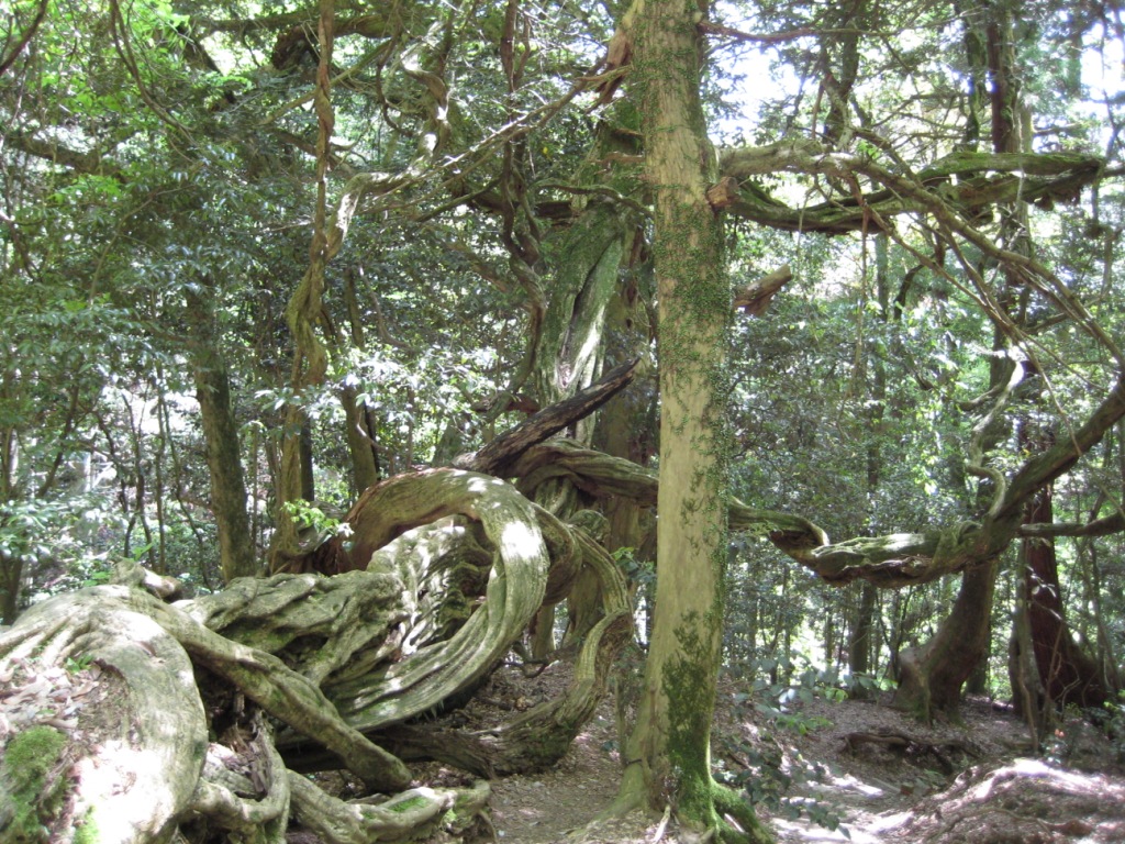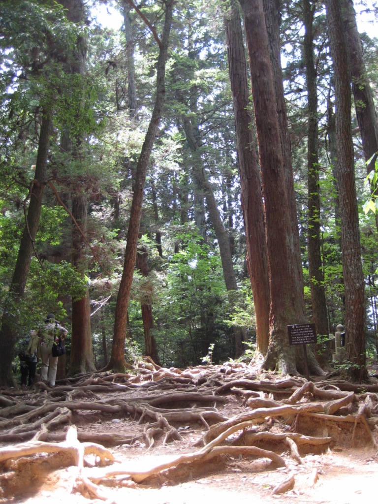 色々と神秘の伝説もある木の根道、看板の説明によると木の根が張れる地層が薄いため、