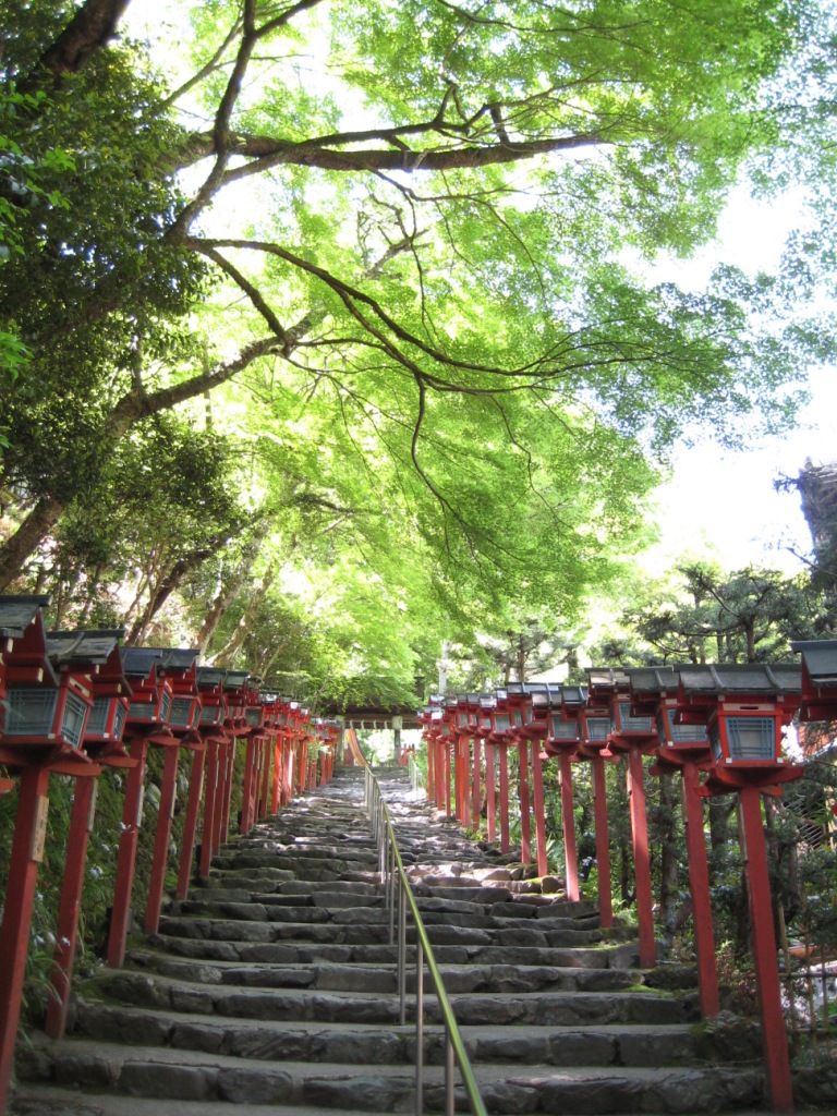 そして写真に撮ってギョッとしました。 この新緑のあおさと、鞍馬寺や献灯の朱の美しさと、澄み渡る空の色。